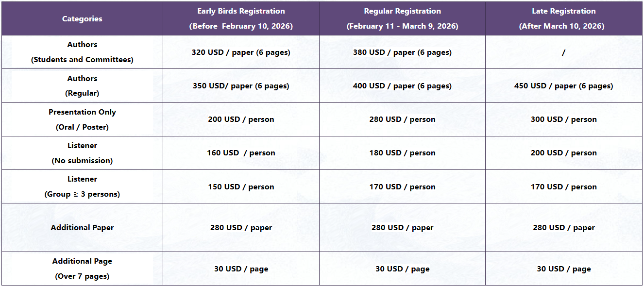 1. Author Participation: one accepted article can have one author attend the conference for free, other authors can register separately.